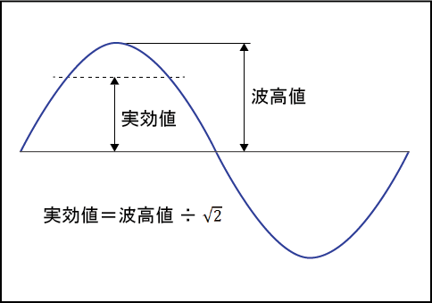 通常の交流の場合、実効値と波高値の間には「実効値=波高値÷√2」「波高値=実効値×√2」という関係があります。