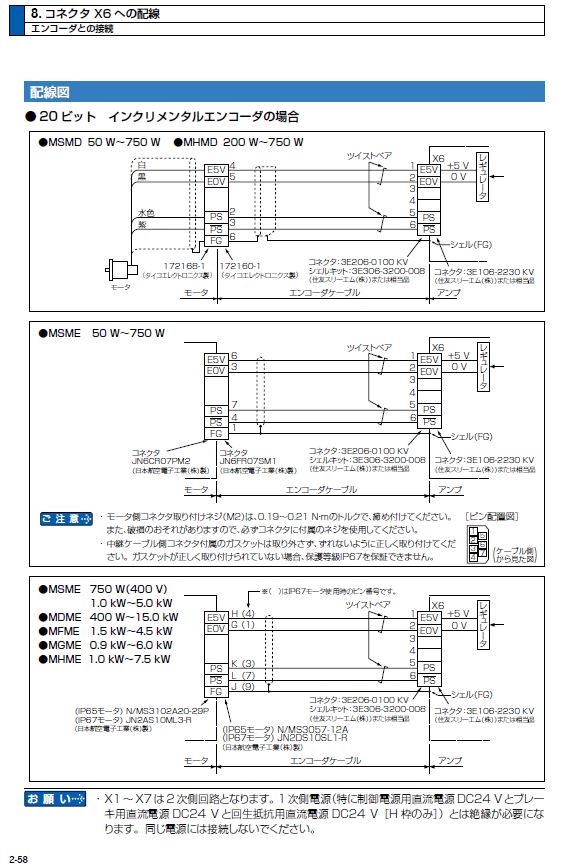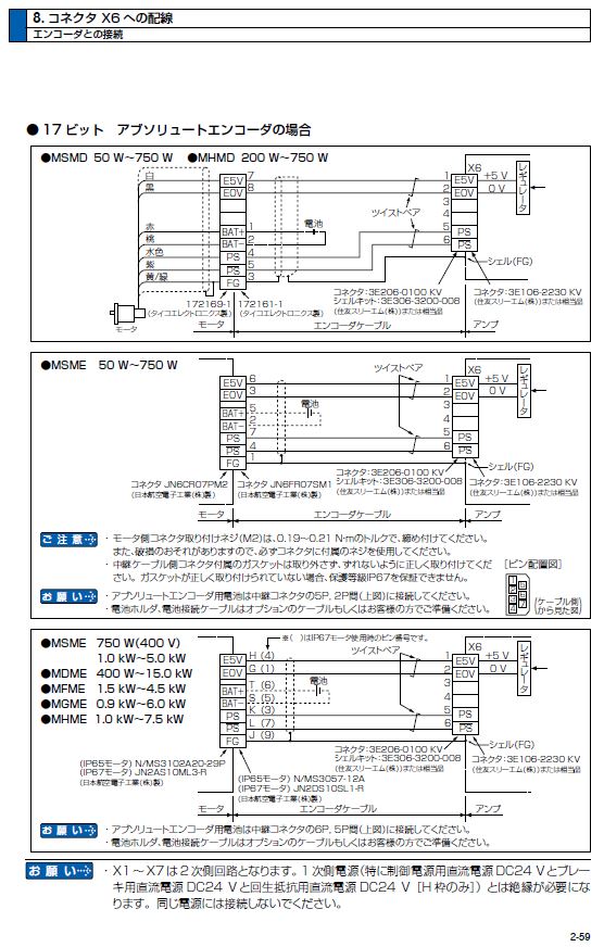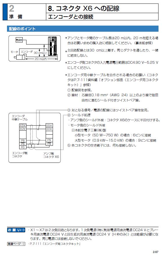 ・取扱説明書の『2.準備 8.コネクタX6への配線 エンコーダとの接続』で、お使いになるモータとエンコーダシステムに該当する配線図をご参照ください。