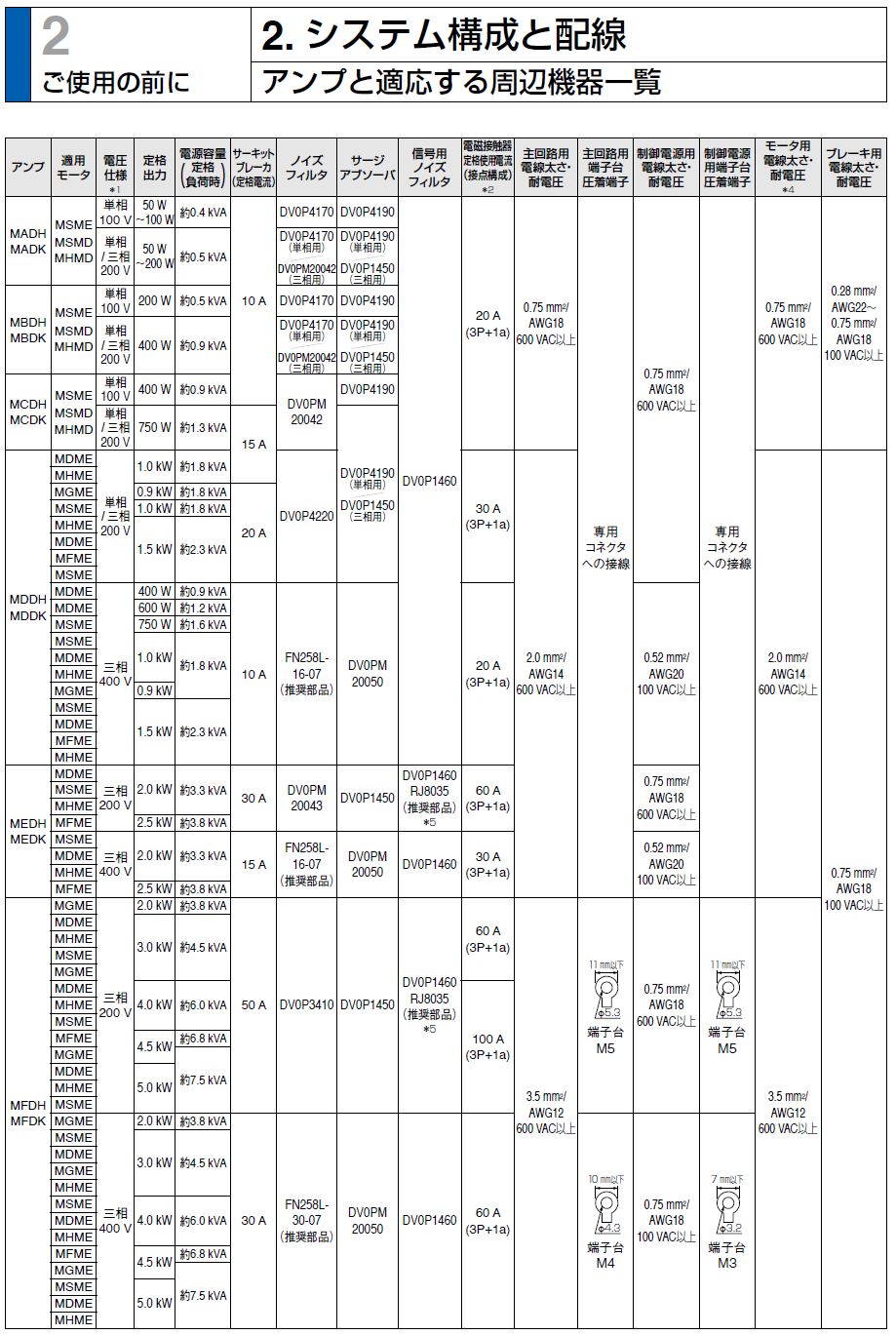 ・取扱説明書の『2.準備 2.システム構成と配線 アンプと適応する周辺機器一覧 適応電線径一覧』をご参照ください。