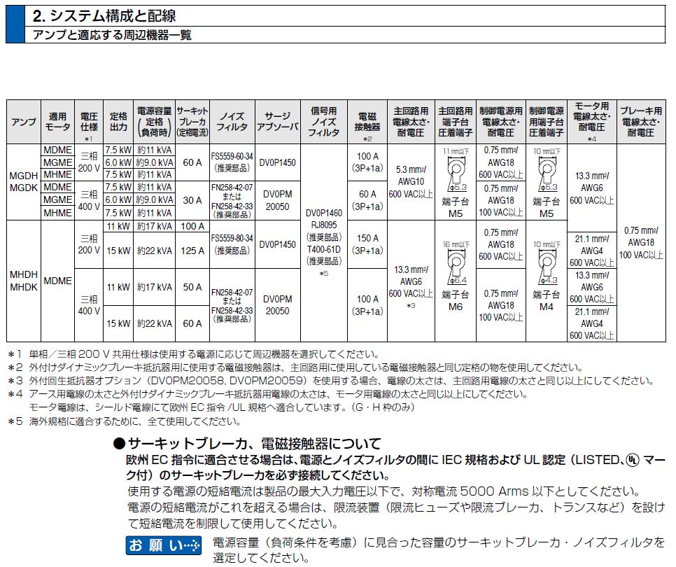 MINAS-A5シリーズのサーボアンプに使用している下記電線の適用電線径を教えてください。・主回路用電線、・制御電源用電線、・モータ用電線、・モータブレーキ用電線