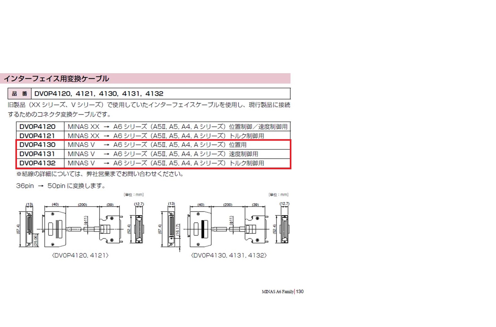 A6の総合カタログに、インターフェイス用変換ケーブル(オプション品)として記載しています。位置制御用、速度制御用、トルク制御用と品番が異なるのでご注意下さい。 https://industry.panasonic.com/jp/ja/products/motor/fa-motor/ac-servo