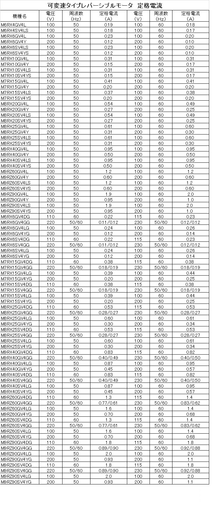 小形ギヤードモータ 可変速タイプレバーシブルモータ の定格電流値を教えてください。[40927]